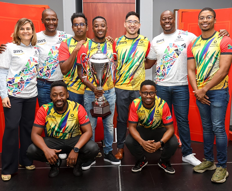 Members of Vodacom management with Team Ama-Glug-Glug members (standing, from left) Jared Naidoo, Gundo Phathela, Jonathan Eastern, Oliver Kongolo, and (in front) Ofentse Monkoe and Mkhuseli Makhambi.