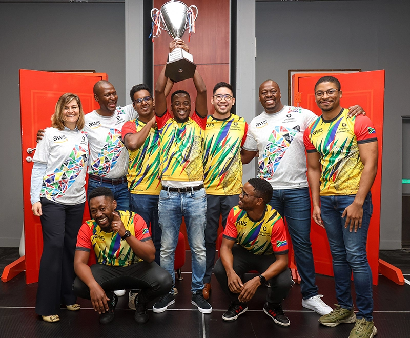 Celebrating with members of Vodacom management are Team Ama-Glug-Glug members (standing, from left) Jared Naidoo, Gundo Phathela, Jonathan Eastern, Oliver Kongolo, and (in front) Ofentse Monkoe and Mkhuseli Makhambi.