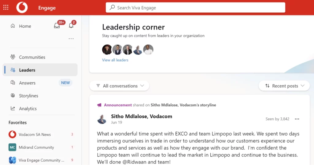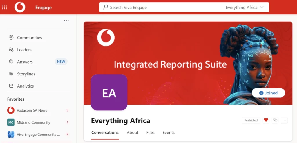 In large companies that span multiple countries, such as Vodacom Group, employees often only know their immediate team or department colleagues. Viva Engage can perform nearly all the functions of an intranet, significantly enhancing internal communication. We can break down the boundaries and interact directly with each other in real time across countries and functions, with no user limit, enhancing functionalities and sharing best practices.